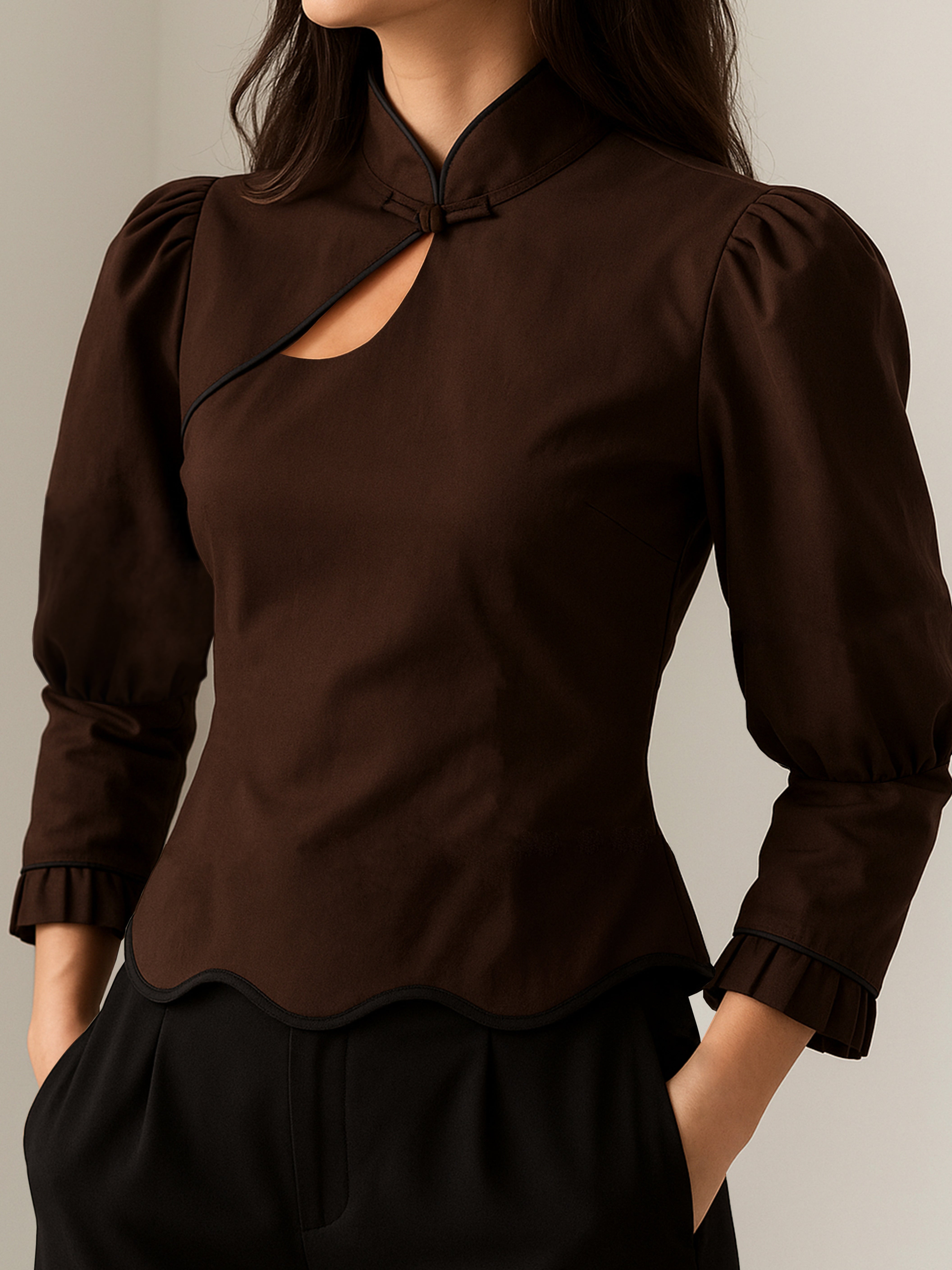 Chocolate Mandarin Cutout Blouse