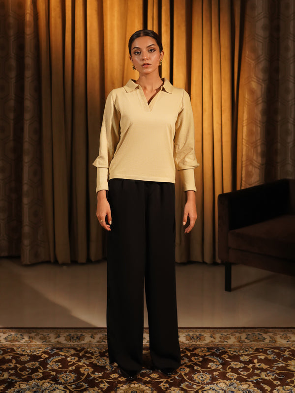 Elevate your wardrobe with this refined yet cozy ribbed polo top. Designed in a soft Dandelion shade, this versatile piece offers a blend of contemporary minimalism and classic tailoring.